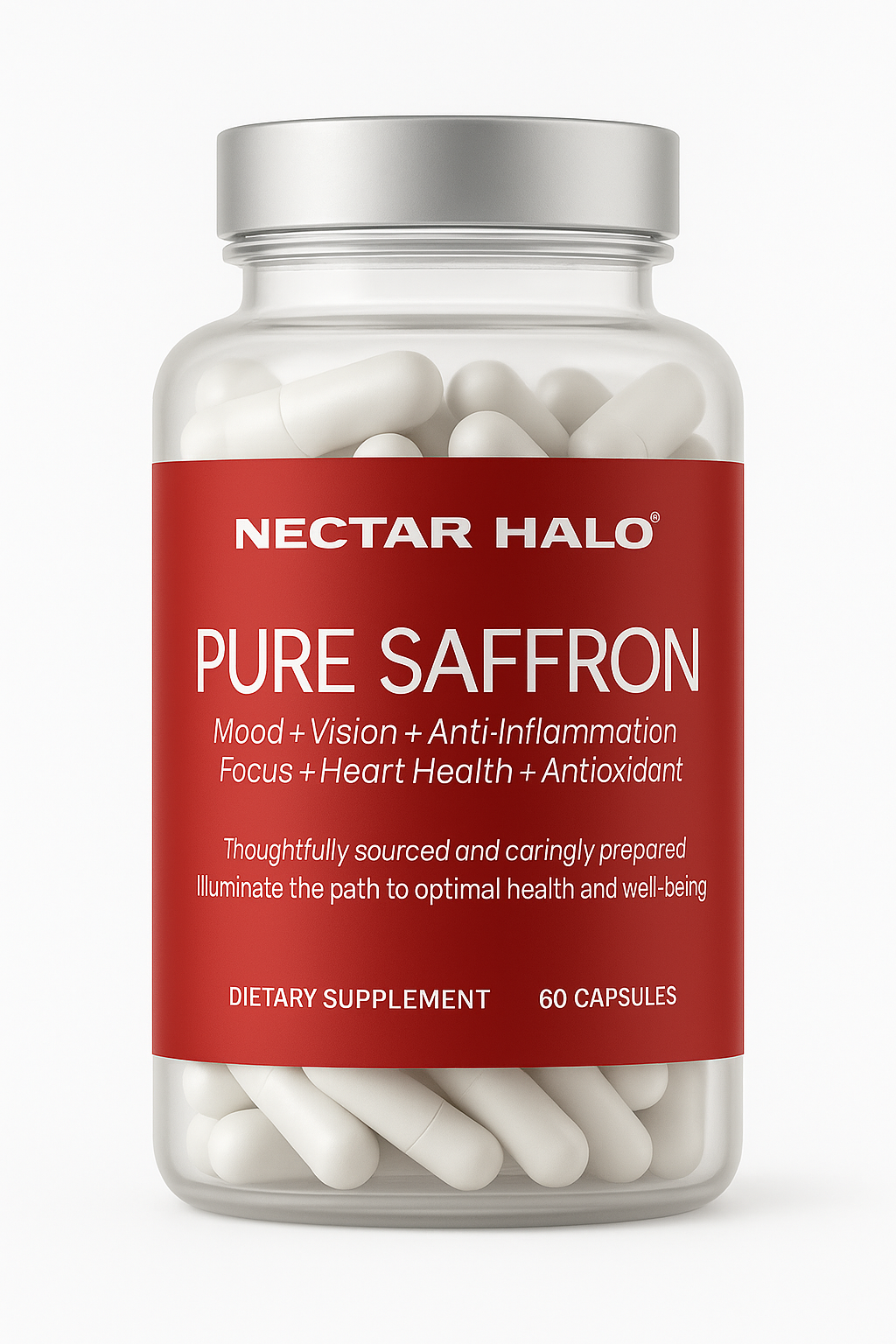 Nectar Halo Pure Saffron Capsules bring you the finest quality natural saffron in a convenient, easy-to-take supplement form. Sourced from premium saffron farms and Made in the USA, these capsules offer an array of health benefits from this remarkable spice, revered for centuries for its wellness-promoting properties. With each capsule, you get 100% pure saffron extract, free from fillers or additives, ensuring maximum potency and effectiveness.